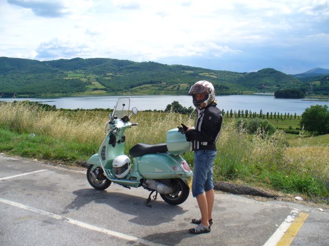 We got stuck behind a queue of cars behind a bus - with two-up, the Hornet just doesn't have the grunt to do those 2-second overtakes - no way Jose. So I stop - just as well, as the best way back was up a road to the left just behind us (to the right once I'd turned round). Plus there was a bar - thank deity, I needed a coffee, and Kristin found something (what was it?) that she seemed very grateful to be eating. There was a delightful elderly lady behind the counter who jabbered away with enthusiasm and delight at the Vespa outside, all the way from Blighty! Whatever she was on, it should be bottled and sold - peace to the world. :)