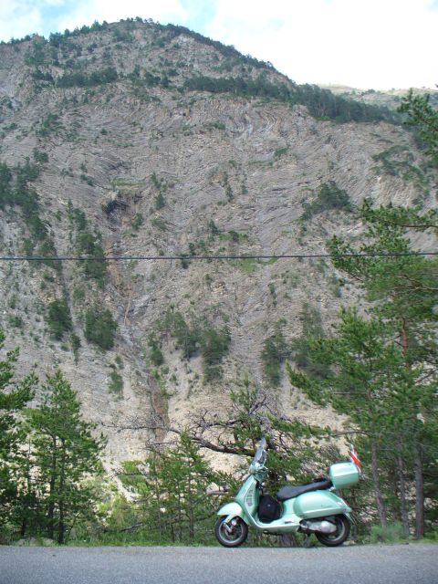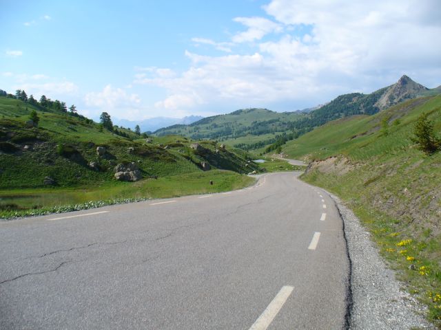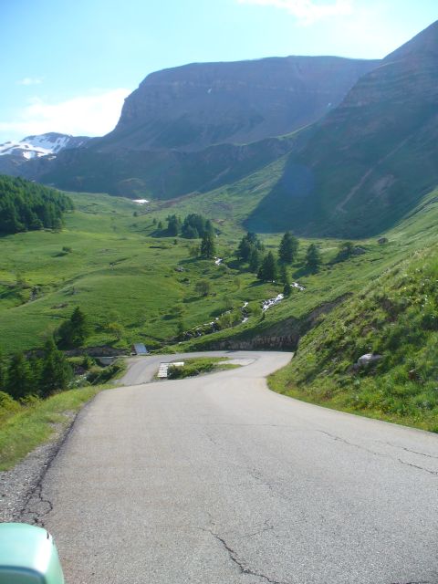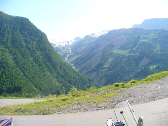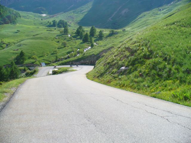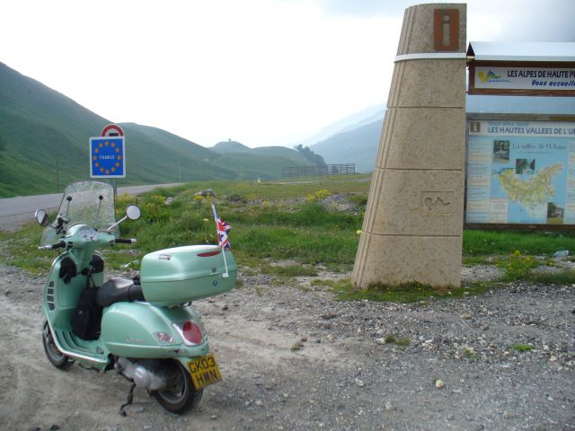 Along the way one small village was having its road resurfaced. Traffic was backed up a huge distance both ends, with people having picnics while they waited. However the tarmac lorries that blocked the road had left a gap for pedestrians. A gap? Like a ferret down a rabbit-hole the Hornet bypassed the enormous and very bored queue and darted through. Completely unperturbed workmen showed me the safe un-sticky path to take, and I was on my way. 25 'tornantes' (hairpins) later and I was at the pass summit, and entering France again.