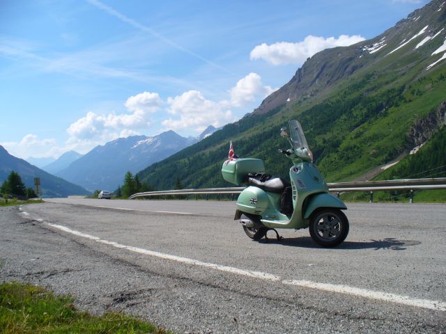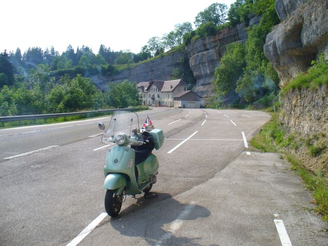 After a brief spell in Switzerland I rode through this gorge, where the rocks each side overhung the road. Some houses along the way almost didn't need roofs.