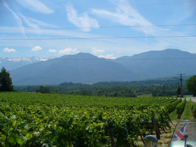 After a gorgeous ride down from the pass, I had a long stretch of boring straight road, so dived off sideways, and soon found a vineyard that I'm sure was featured on Oz Clarke's and James May's wine tour. IIRC the vines the other side of the road ahead at the T-junction would produce wine at EUR200 a bottle, the ones this side only (!) EUR30 a bottle. All to do with 'le terroir' apparently.